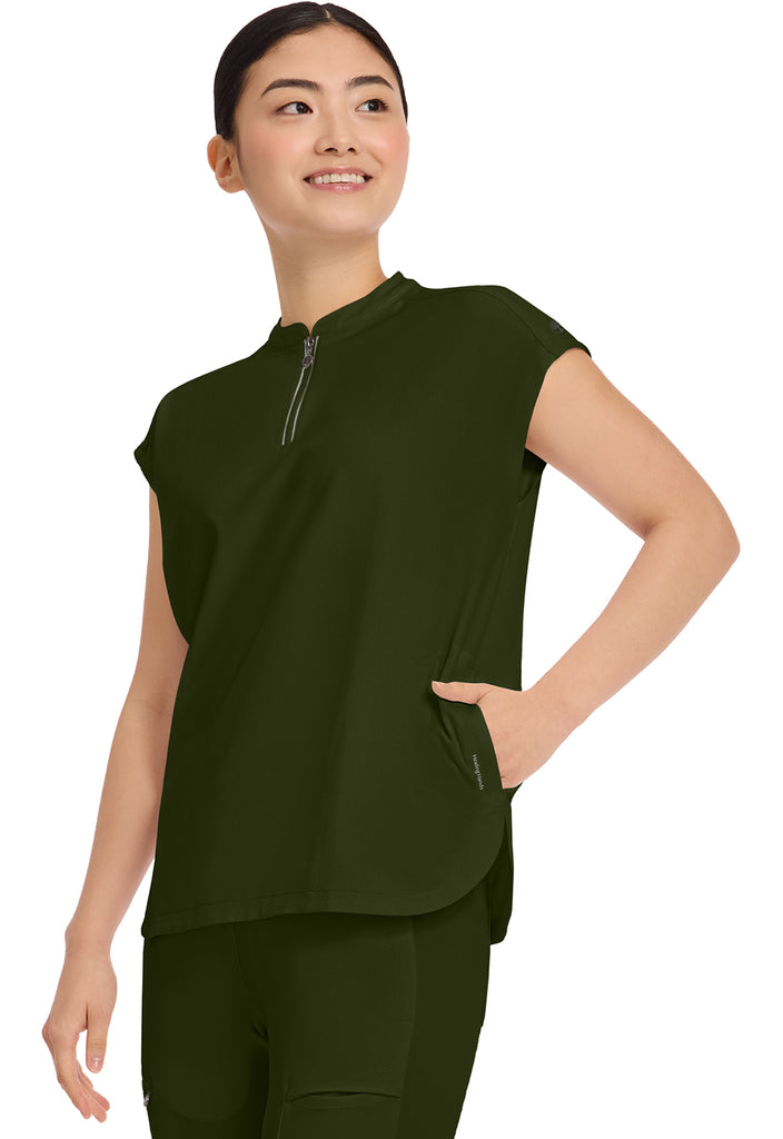 Oversized comfy Mandarin Collar Boxy top features collared neckline with half zip, dolman sleeves, 2 welt pockets, rounded hem & back yoke box pleat detail. Knit trim at front shoulder and back yoke add to this tops charm.